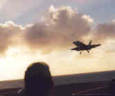 The Connie launched jets and planes at 1230 for a 1300 air show. What a show! No less than three sonic booms over the carrier’s flight deck by Tomcats and Hornets; small charges, but live ordnance dropped on "smoke" in the ocean. Helos provided the smoke markers. As the jets rolled by, missile decoy flares were dropped for show. The various jets did Imelmans (a vertical roll/flip maneuver), went completely vertical in ascents and many other maneuvers. Destroyer escorts came along and fired their five inch guns. Lots of stuff. The day was perfect for it. Partly cloudy, high ceiling sky and comfortable to be up there in a short sleeve shirt. Breezy across the flight deck with the ship’s movement.