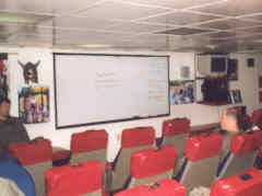 I’m sitting in the VS-38 Squadron Ready Room. Red floor for the Red Griffins. Same bulky heavy chairs that were here since Connie’s commission in 1961. The USS Constellation has been in service for 37 years. Many of these chairs were once occupied by flyers who never returned to Connie after missions over Vietnam and elsewhere. My back is aft and I’m facing forward in ship space. To my left are three computer stations used by the Squadron for "stuff" and E-mail. A video camera on the flight deck sends pictures of the deck area onto a TV screen set up in front and on my right. The video is mounted over another TV set which is used for ships information, movies and whatever. Aircraft launches and recovery operations are monitored by the video camera and recorded on a master tape somewhere else.